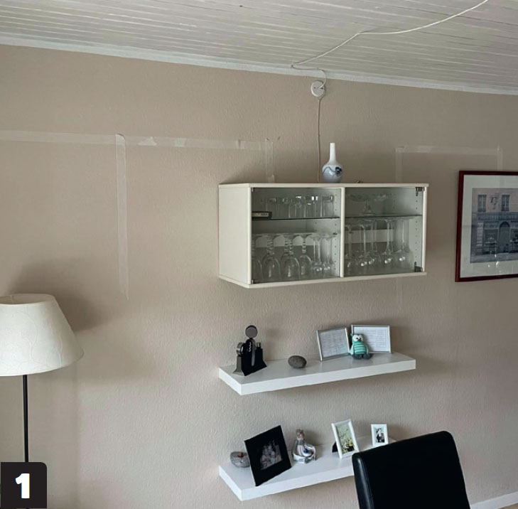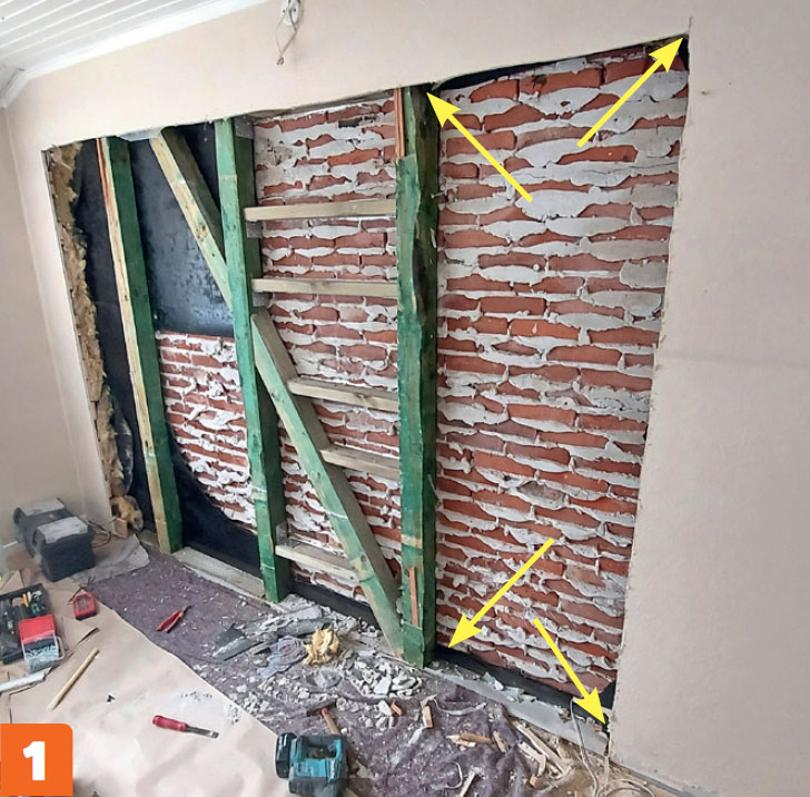 Väggen är inte bärande, så vi slipper stötta den och mura in en tegelbalk utan kan nöja oss med att såga i gipsväggen för att ta reda på exakt var de stående reglarna befinner sig.