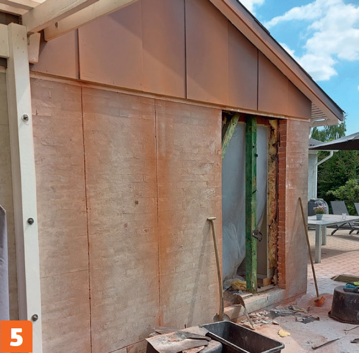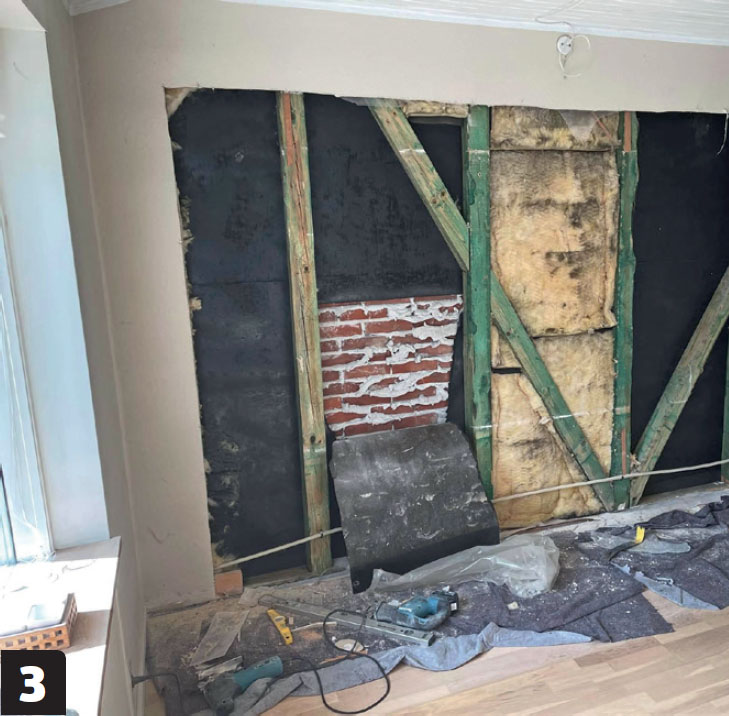 Gipsväggen byggs upp igen. Mineralullsskivor läggs in i väggen och ångspärr sätts upp. Utanpå ångspärren skruvas upp gipsskivor och skarvarna spacklas.