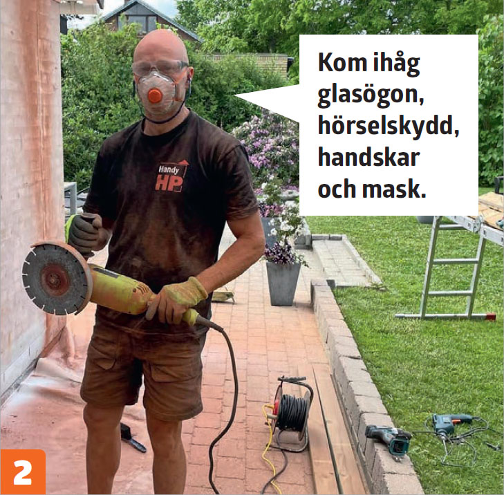 Hålen sågas. Med en stor betongsåg med diamantkapskiva går det hyfsat lätt att såga ut hålen. Markera från markeringshål till markeringshål och såga 5-6 mm djupa spår längs strecken.