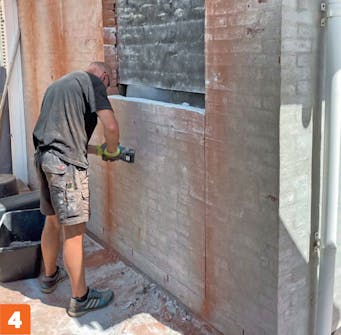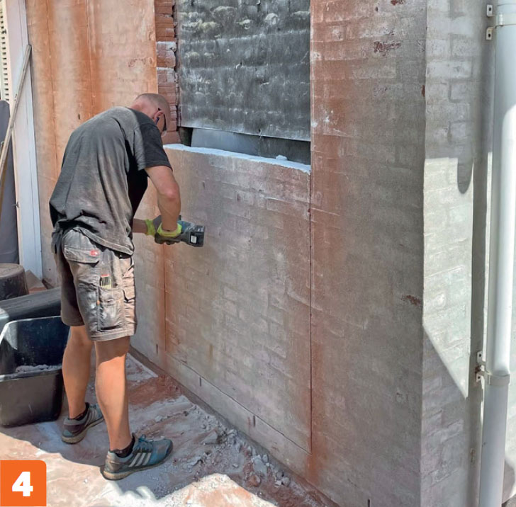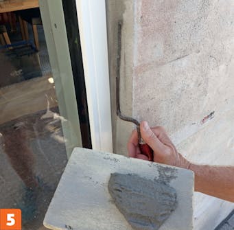 Kanterna jämnas till. Först “knäcks” de vassa tegelkanterna med en bit av en tegelsten som dras upp och ner längs kanterna. Därefter putsas alla sidor med murbruk. Det är mycket lättare att göra det innan fönsterna sätts i, och det har härdat till nästa dag.