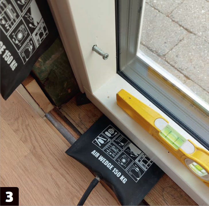 Från insidan sätts winbags på plats längs fönstret - två nederst och två på varje sida, uppe och nere. Sedan ska de blåsas upp och justeras tills fönstrets undersida är vågrät och sidorna lodräta åt båda hållen.