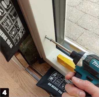 Du kan palla upp fönsterna på plastkilar eller träkilar, men enklast är att använda uppblåsbara kilar, så kallade winbags. De är superenkla att justera så att fönstret hamnar exakt i lod och våg innan det skruvas fast.