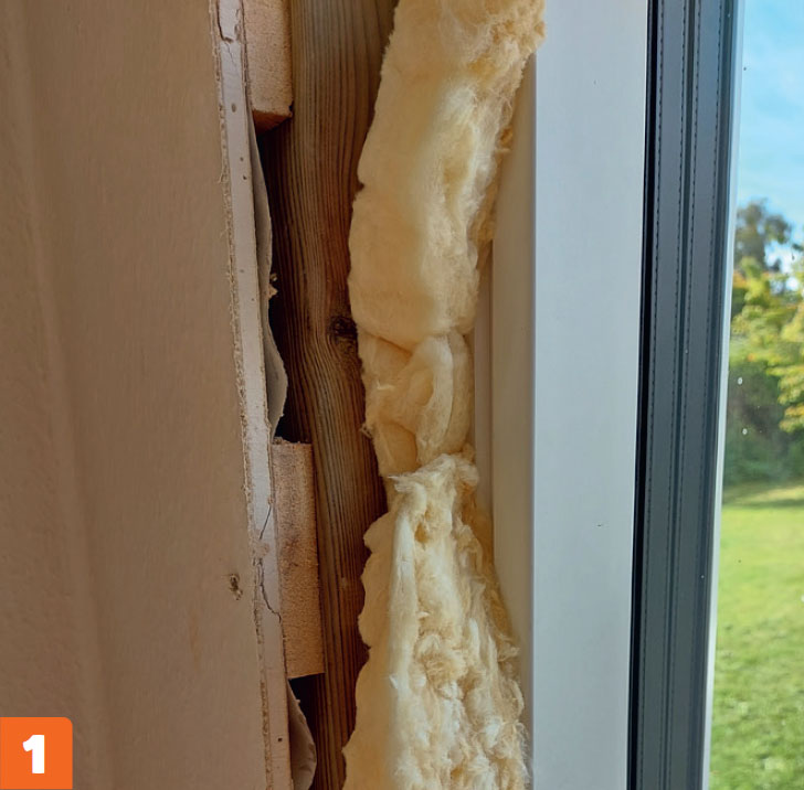 Fogarna stoppas med mineralull. Du kan mycket väl återanvända isoleringen från den gamla väggen, men du slipper skära upp den i strimlor om du köper så kallad drevremsa på rulle som här.