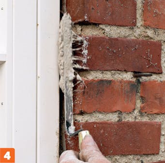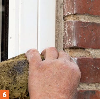 De utvändiga fogarna fylls med bruk. Det är också möjligt (och lite enklare) att använda expanderande fogband som köps på rulle. Men väljer du att foga med murbruk, använd då ett färdigblandat torrbruk.