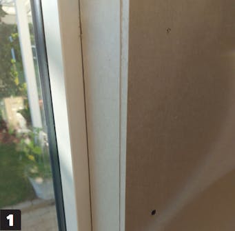 Karmskruvarna monteras. 3 skruvar sätts på varje sida och 1-2 skruvar överst, och skruvarna skruvas ända in. De har inte något egentligt huvud, så de försvinner in i karmen och täcks med ett plastlock.