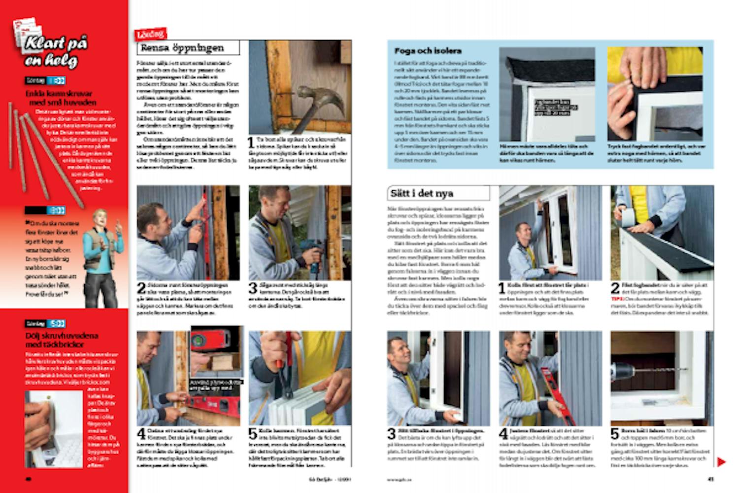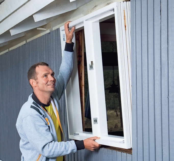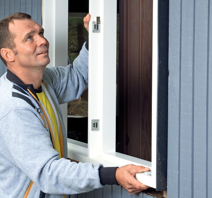 Sätt fönstret på plats och kolla att det sitter som det ska. Här kan det vara bra med en medhjälpare som håller medan du kilar fast fönstret. Borra 6 mm hål genom falsarna in i väggen innan du skruvar fast karmen. Men kolla noga först att den sitter både vågrätt och lodrätt och i nivå med fasaden.
