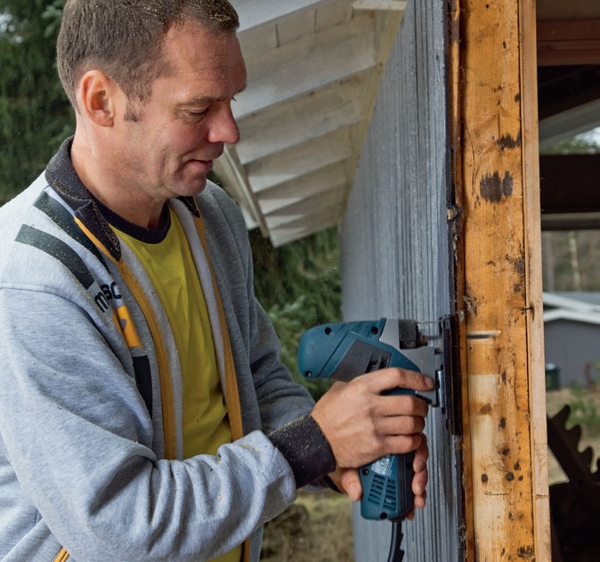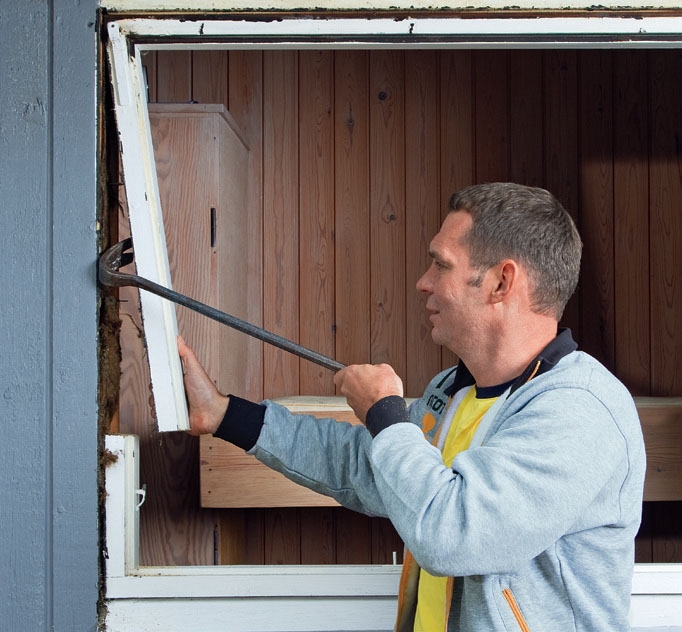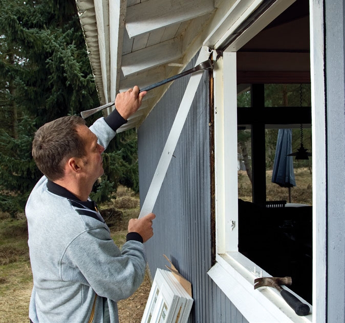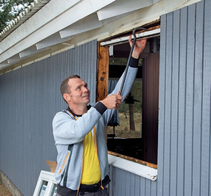 Om karmträet i dina fönster är gammalt och därför ska bytas ut, kan du såga av karmen på sidorna (precis som vi visar). Men om du byter ut fönstren för att du vill ha ett nytt glaspaket, kan du ev. behålla dem och beställa enbart nytt glaspaket. Ur energisynpunkt lönar det sig dock att byta både karm och båge.