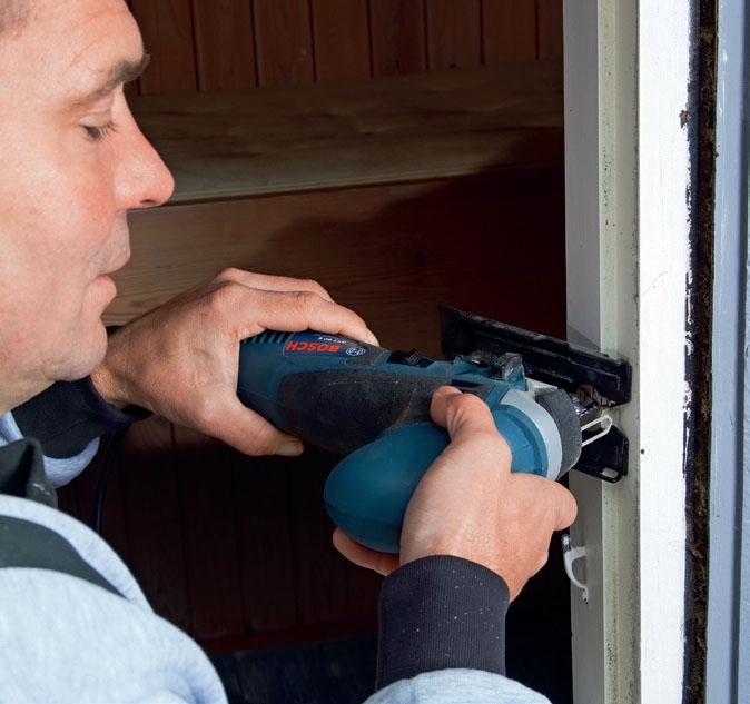 Såga rent med sticksåg längs kanterna. Det går också bra att använda annan såg. Ta bort fönsterbrädan om den ändå ska bytas.