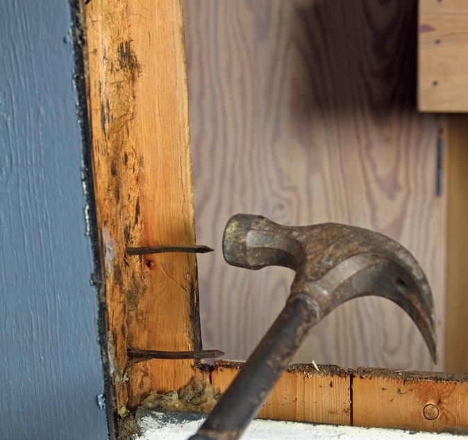 Ta tag med kofoten och vrid loss delarna från varandra. Bryt sedan bort karmen. Ibland sitter karmar fast med långa skruvar eller spikar. Lägg då en kloss bakom kofoten så att du får mer kraft.
