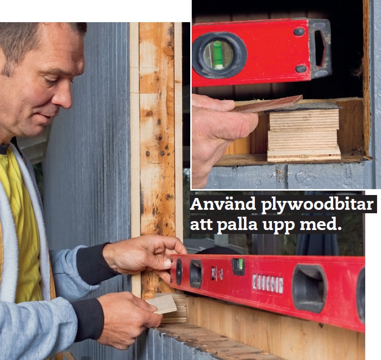 Justera fönstret så att det sitter vågrätt och lodrätt och att det sitter i nivå med fasaden. Lås fönstret med kilar medan du justerar det. Om fönstret sitter för långt in i väggen blir det svårt att fästa foderlisterna som ska dölja fogen runt om.