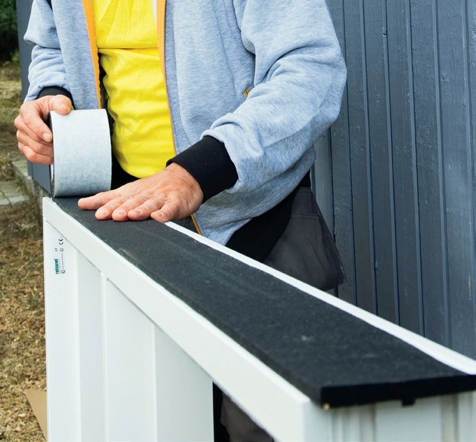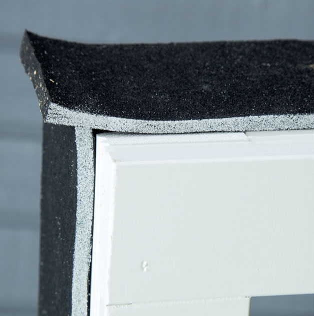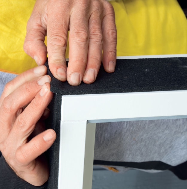 I stället för att foga och dreva på traditionellt sätt använder vi här ett expanderande fogband. Vårt band är 88 mm brett (Illmod Trio) och det tätar fogar mellan 10 och 20 mm tjocklek. Bandet levereras på rulle och fästs på karmens utsidor innan fönstret monteras. Den vita sidan fäst mot karmen. Ställ karmen på ett par klossar och fäst bandet på sidorna. Bandet fästs 5 mm från fönstrets framkant och ska sticka upp 5 mm över karmen och ner 15 mm under den. Bandet på ovansidan ska vara 4-5 mm längre än öppningen och viks in över sidorna där det trycks fast innan fönstret monteras.