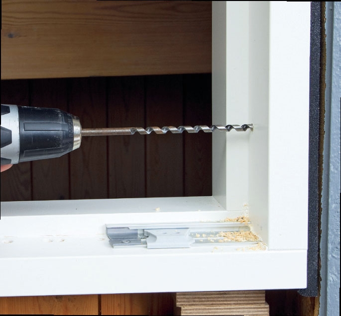 Skruva fast fönsterbrädan i ändarna och fäst skruvarna så långt upp att de täcks av de lodräta foderlisterna. Förborra innan du skruvar för annars spricker träet. Använd rostfria skruvar för att det inte ska bli roströda märken på träet.