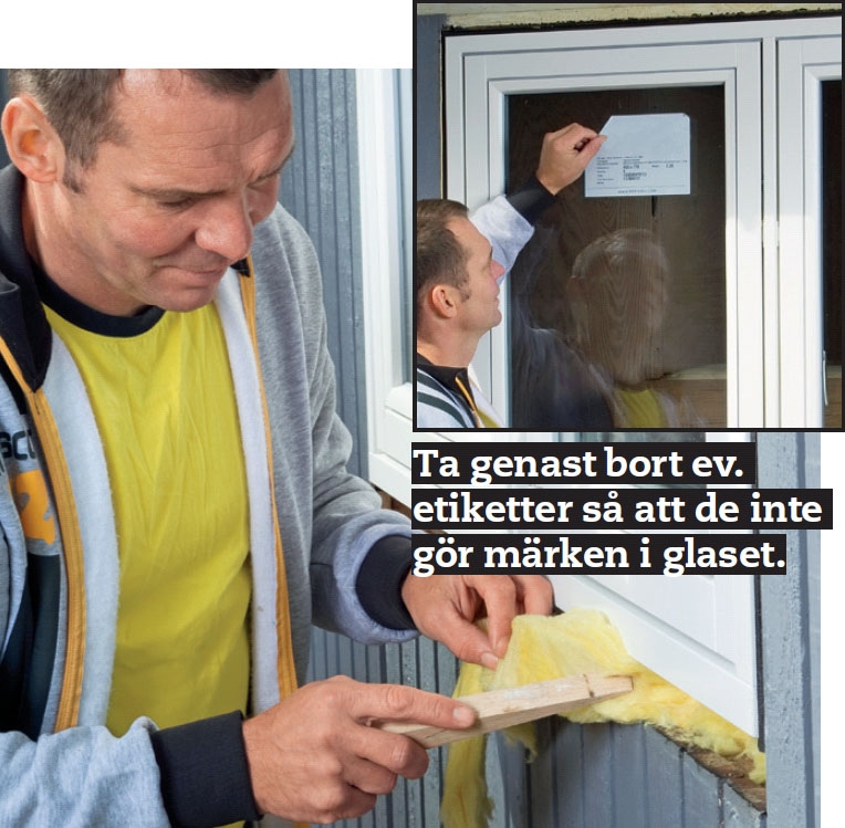 Kolla först att fönstret får plats i öppningen och att det finns plats mellan karm och vägg för fogband eller drevremsor. Kolla också att klossarrna under fönstret ligger som de ska.