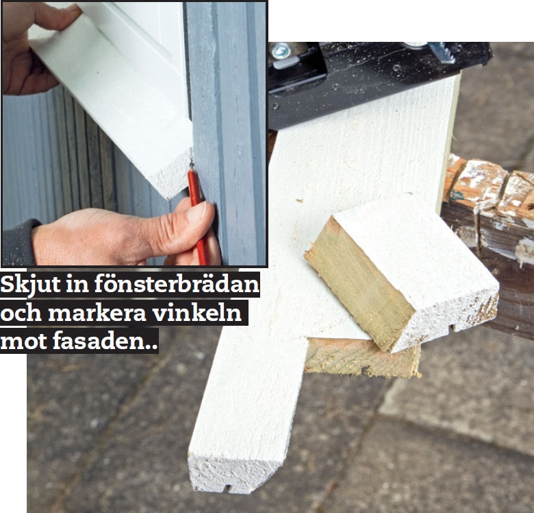 Såga fönsterbrädan så att den sticker ut 15 mm på båda sidor om de lodräta foderlisterna. De har ännu inte monterats, så du måste lägga till bredden av dem. När du har markerat för vinkeln sågar du urtag och sätter brädan på plats.