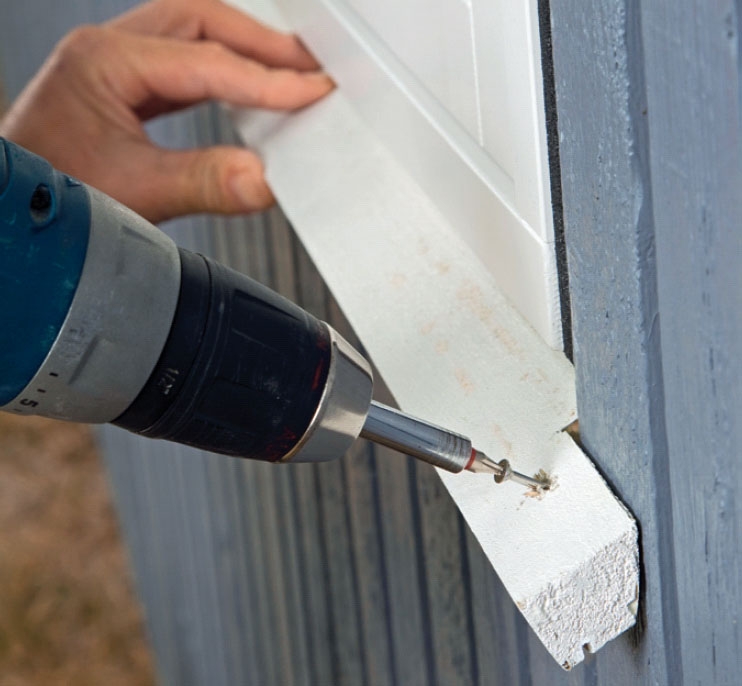 Markera på de lodräta foderlisterna var de ska sågas av nertill. Om du gör som vi visar på bilden får de rätt vinkel och följer brädan. Skruva fast de två foderlisterna och fortsätt med den vågräta överliggaren.