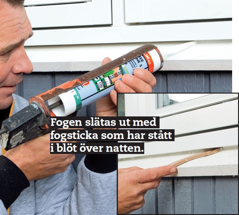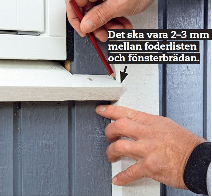 Under karmen fästs en fönsterbräda med lutning utåt, så att regnvatten från fönstret leds bort från fasaden. Till både foderlister och fönsterbräda använder vi här 22 x 95 mm brädor, som har strukits med träolja och utelasyr innan de monteras. Några millimeter från den yttre långsidan av fönsterbrädan har vi sågat ett spår med cirkelsåg. Det fungerar som droppkant för regnvatten.