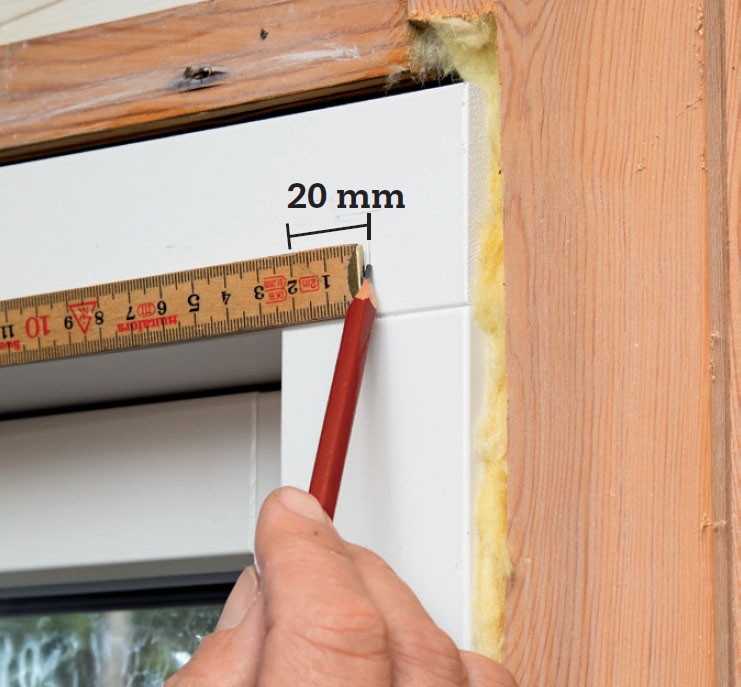 Markera hela vägen runt var foderlisterna ska sitta. Här har vi dragit in dem så att de delvis täcker karmen och lämnar 2 cm av den synlig. Då försvinner fogen mellan karmen och väggen.