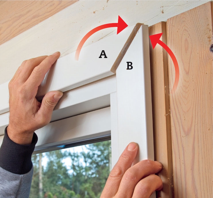 När fönstret sitter på plats och du har drevat med isolering under karmen, ska du sätta upp foderlister som täcker fogen mellan karmen och väggen. Foderlisterna består här av en vågrät överliggare, som vi låter sticka ut 15 mm över sidolisterna.