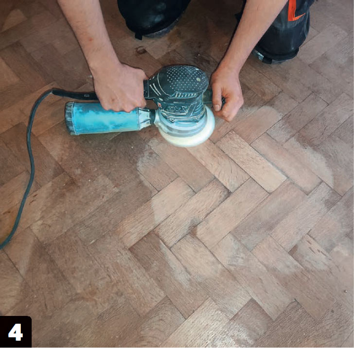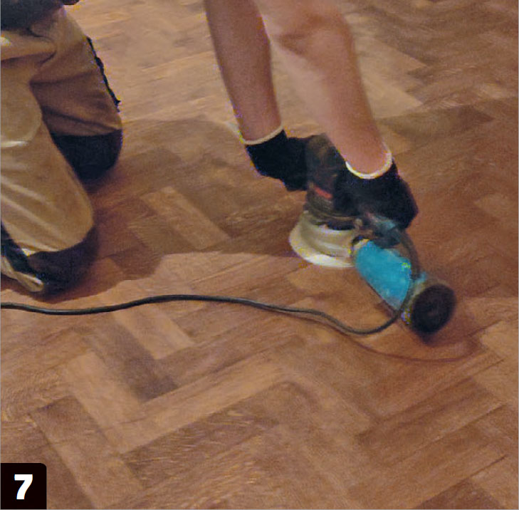 Slipa golvet en sista gång med korn 240 när oljan har fått torka i 24 timmar. Listerna får samma behandling som golvet och sätts upp igen - och golvet är nästan så gott som nytt.