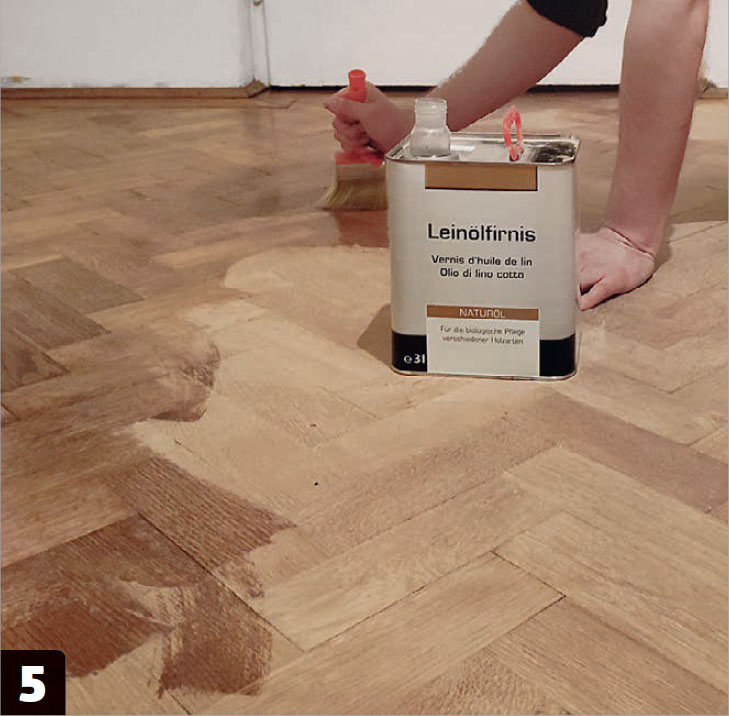 Golvet får första gången linoljefernissa. Oljan stryks på med pensel eller trasa så jämnt som möjligt. Linoljefernissa torkar snabbare än kallpressad linolja, tränger in djupare och bildar en hinna - bra för ett golv.