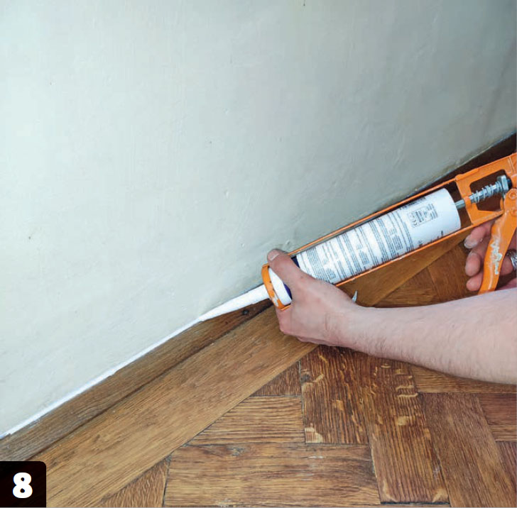 Fyll sprickorna med PU-lim. Blanda eventuellt i lite slipdamm för att matcha färgen på parkettgolvet så nära som möjligt. Dra spacklet över sprickorna så att de fylls helt.