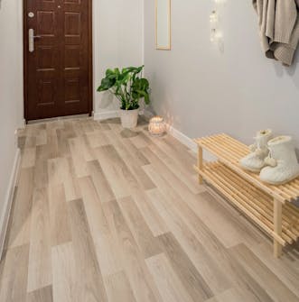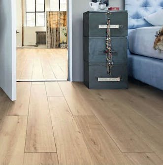 Liknar till förväxling ett golv av trä eller klinker, men det är gjort av samma hårda och rengöringsvänliga sorts laminat som köksbänksskivor. Superslitstarkt men kan ofta försämra akustiken i rummet.