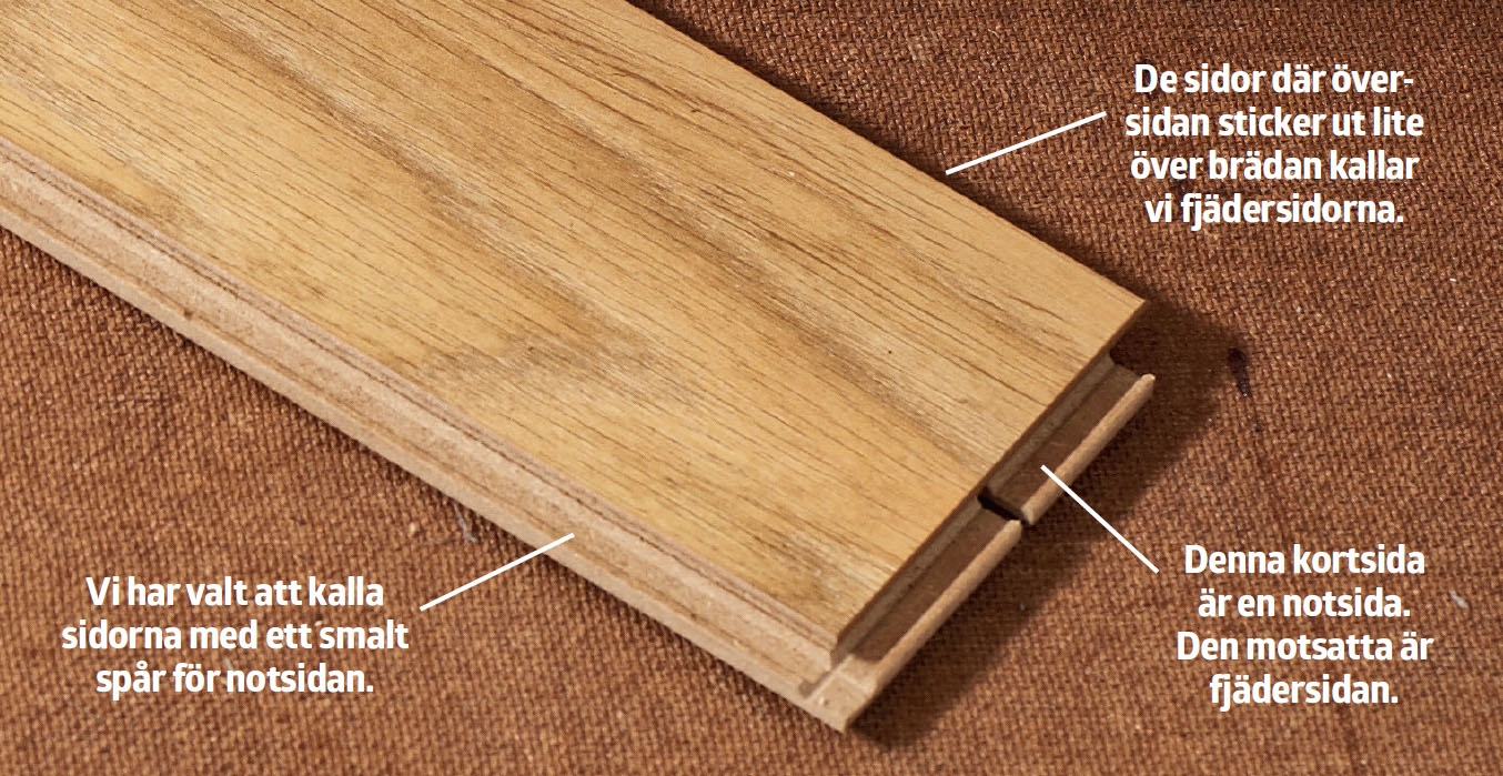 Stavarna har klicksystem på alla fyra kanter. På den ena kortsidan och den ena långsidan finns ett spår (en not). På de två övriga sidorna finns en spont (fjäder), som passar in i noten. För att ha koll på allt vänder vi noterna in mot den vägg vi startar från. Här har vi markerat tre av ”väggarna” med reglar.