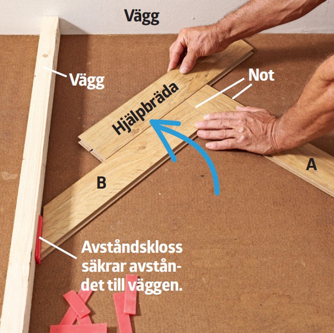 Innan du kan börja lägga golvet ska du göra en provuppläggning, som visar hur golvet ska ligga för att bli så fint som möjligt.