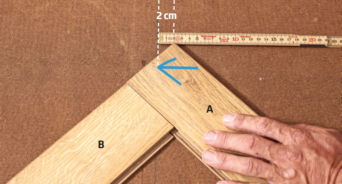 Golvet kan skjutas på plats, när staven B är tillsågad efter markeringen. Då hamnar vårt mönsters spets precis på mittlinjen (2 cm åt vänster).