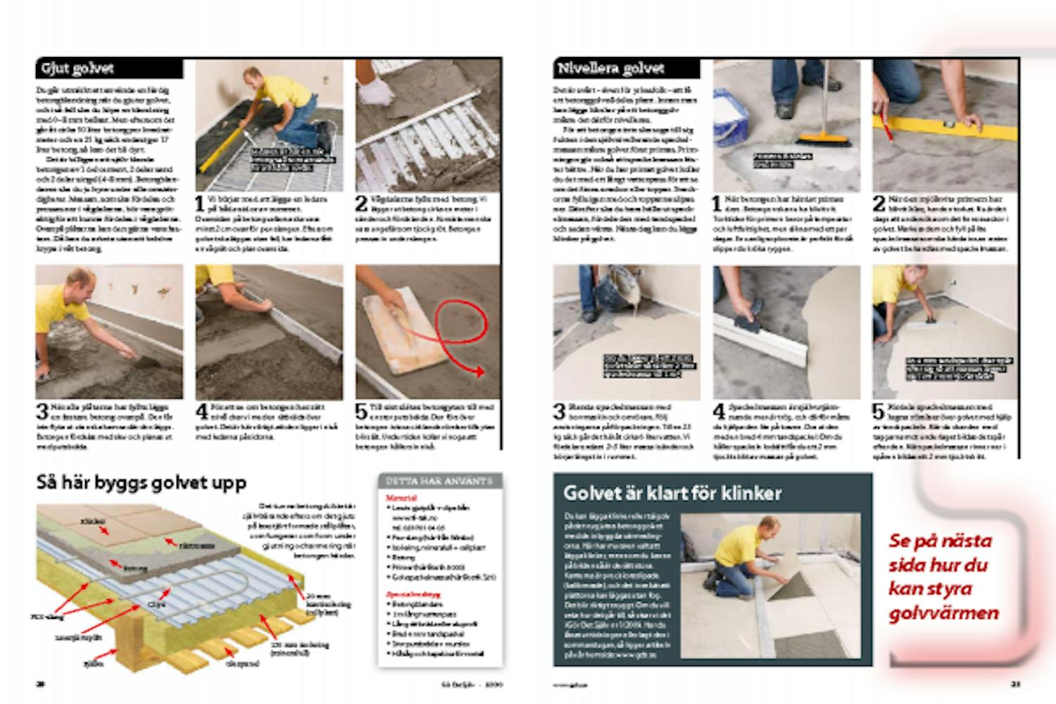 Du kan lägga klinker eller trägolv på det nygjutna betonggolvet med de inbyggda värmeslingorna. Här har muraren valt att lägga klinker, men som du kan se på bilden så är de rätt stora. Kanterna är precisionsslipade (kalibrerade), och det innebär att plattorna kan läggas utan fog. Det blir riktigt snyggt. Om du vill veta hur det går till, så visar vi det i Gör Det Själv nr 1/2009. Har du lånat ut tidningen eller lagt den i sommarstugan, så ligger artikeln på vår hemsida: www.gds.se