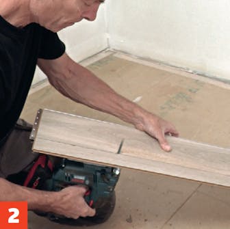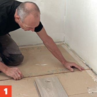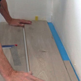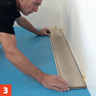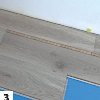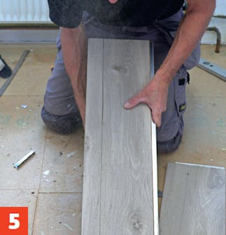 Klicka fast nästa bräda i den första raden. Klicksystemen skiljer sig från golv till golv. Här ska brädan lyftas lite, sättas på plats och tryckas ner.