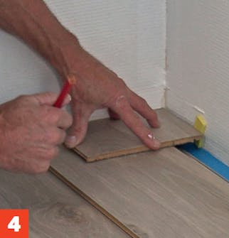 Det gör du genom att dra ett streck i exakt samma höjd över golvet i hela listens längd med en blyertspenna som ligger på en kloss.