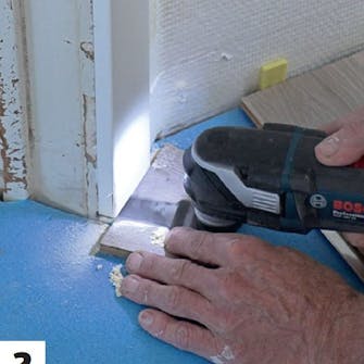 Såga ut en kil ur golvbrädan med sticksågen. Markera först mellan hålen och med diagonala snitt från hörn till hål.
