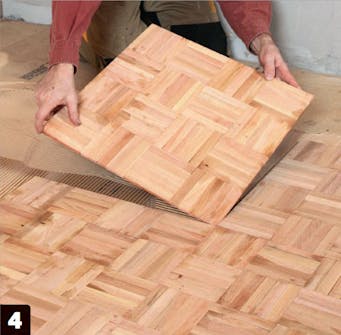 Här bildar de små stavarna en 50 x 50 cm stor platta. Alla plattor måste vara helt limmade på underlaget och samtidigt måste de också vara limmade i alla fogar.