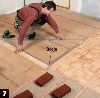 Kontrollera styrbrädans vinkel ännu en gång. Börja läggningen i hörnet där det befintliga golvet och styrbrädan möts.