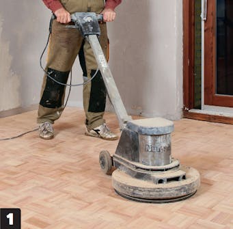 Slipa golvet när limmet har härdat. Vi rekommenderar att du väntar två dygn innan du slipar. För att ta bort alla ojämnheter, börja med korn 80 och avsluta med korn 120.