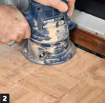 Slipa kanterna med en kantslip eller excenterslip. Den roterande rörelsen hos excenterslipen ger minst slipmärken, men kan vara svår att komma åt med i hörn.