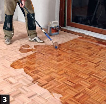 Applicera träolja med pensel eller roller. Träet ska mättas, så var generös när du applicerar oljan. Det är viktigt att golvet dammsugs och torkas ordentligt innan oljning.