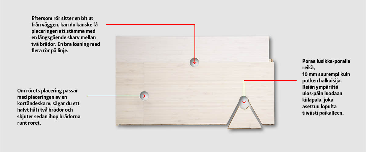 Den första brädan ska sågas till för att brädorna ska gå jämnt upp i rummet (det avslöjade vår mätning). Sågar du med sticksåg, ska du såga från undersidan så att träet inte trasas sönder på ovansidan. Såga annars med cirkelsåg.
