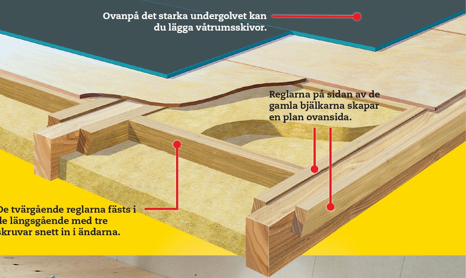 Om någon av bjälkarna sticker upp hyvlas den ner i nivå med ovansidan av reglarna. Är det stor skillnad kan du låta de undre golvskivorna vila på reglarna. Nästa omgång skivor täcker sedan bjälkarna.