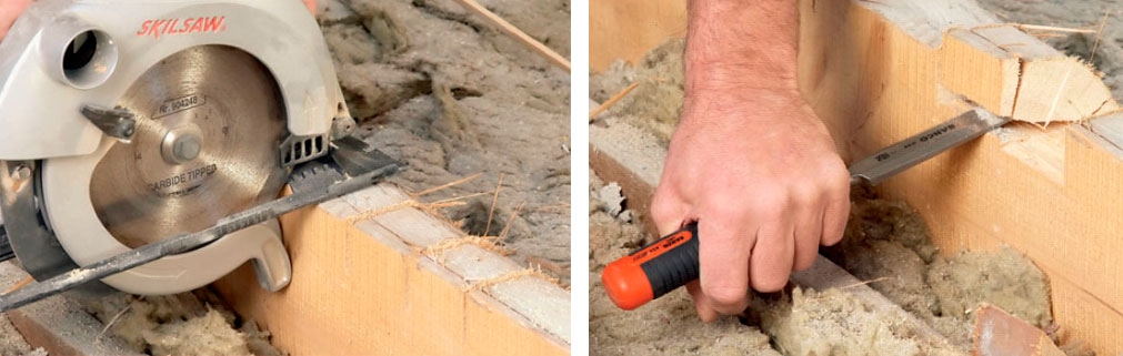Här hamnar reglarna ovanför de flesta bjälkarna, men den ena bjälken sticker upp så mycket att vi väljer att hyvla ner den en bit.