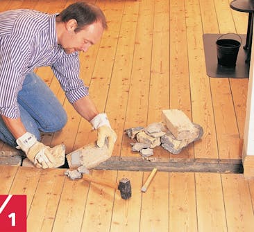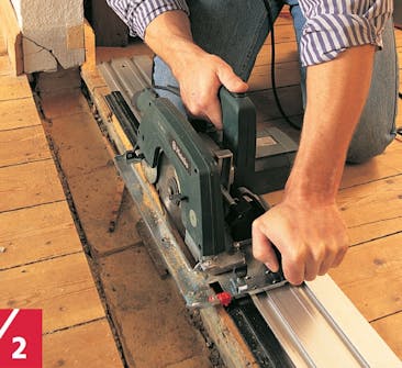 Jämna till kanterna på de gamla golvbrädorna med cirkelsåg. Se till att hålet blir rektangulärt. För sågen längs en skena eller ett såganhåll.