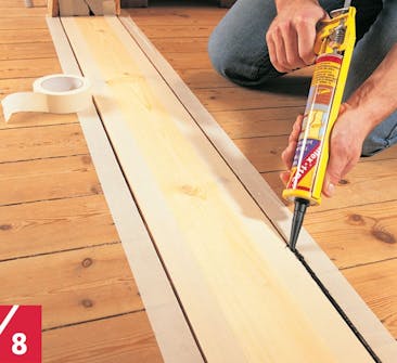 Isolera med mineralull för ljuddämpning, och lägg den nya brädan på plats. Tryck ner en bakstoppninglist av skumplast i fogarna runt brädan.