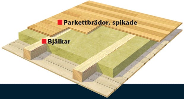 Kravet på ett plant underlag för parkettgolv gäller också om du lägger golvet - eller undergolvet - på bjälkar eller reglar. Reglarna och bjälkarna rätas upp med klossar eller kilar.