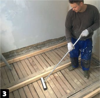 Slipa golvet med sandpapper (korn 120). Har golvet blivit smutsigt kan du eventuellt använda en excenterslip. I vårt fall kunde vi nöja oss med en slipkloss monterad på ett kvastskaft. Slipa lätt.