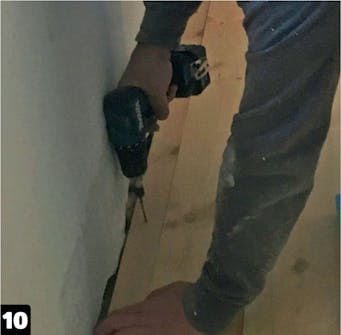 Börja med att sätta en skruv lodrätt ner i den första brädan ett par cm från väggen. Vi kan inte dölja den innersta skruven, så vi accepterar bara skruvhålet och täcker det när hela golvet har lagts.