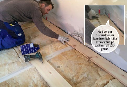 När själva golvet ska läggas är det viktigt att lägga den förste brädan helt rakt. Är rummet snett måste du såga till brädan. När den första brädan har skruvats fast går det snabbt att lägga golvet.