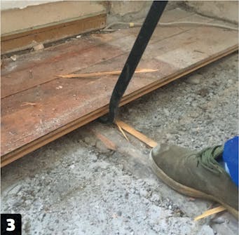 När du tagit bort den första golvbrädan är det bara att bort resten med kofoten. Gör dig av med brädorna så snart de har lossats. De tar plats och är fulla av spik.