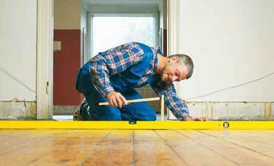 Här skall det nya parkettgolvet läggas ovanpå ett gammalt brädgolv. Detta är emellertid ojämnt som en tvättbräda och duger därför inte som underlag. Det allra första som skall göras är därför att få brädgolvet plant.