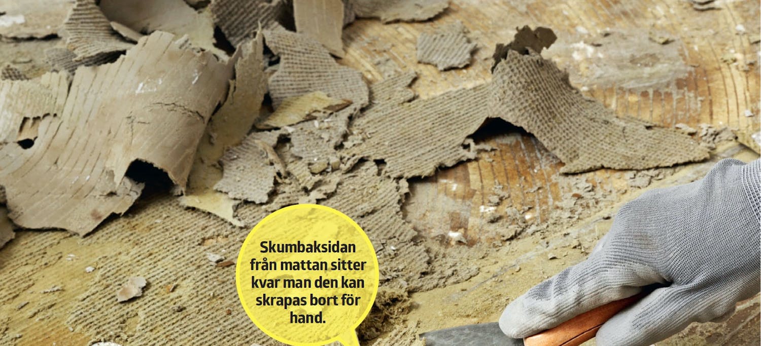 Man tror ofta att det är lätt att rycka bort en gammal heltäckande matta som har limmats fast. Jo, mattan lossnar men i regel sitter skumbaksidan kvar och den ska tas loss för hand med en spackel. De sista resterna tas med lampolja och en trasa. I annat fall återstår inget annat än att slipa golvet med grovt slippapper.